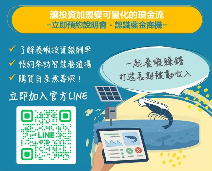 【艾養蝦】總部從找場地到出資建廠、養殖輔導、銷售通路建置一條龍服務。加盟者免經驗、免顧店、免囤貨,只需要投資設備即可手機遠端管理你的智能養蝦場,輕鬆養出高品質益菌蝦!透過室內AIoT科技養殖,讓產出不再靠天吃飯,獲利成為可預期的事業收入,加入科技農夫像開便利商店一樣簡單!