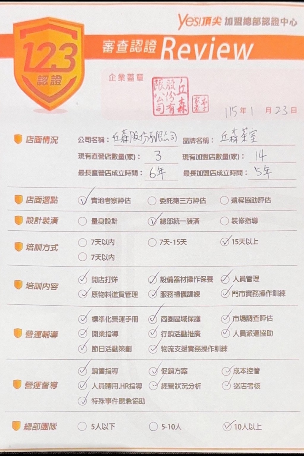 經YES頂尖!創業加盟網審查機制認證中心,丘森茶室 品牌符合123程序機制,具備一定的經營能力,可複製性強,並且能夠為加盟投資者提供良好的幫助與輔導,建議加盟者到店察看!