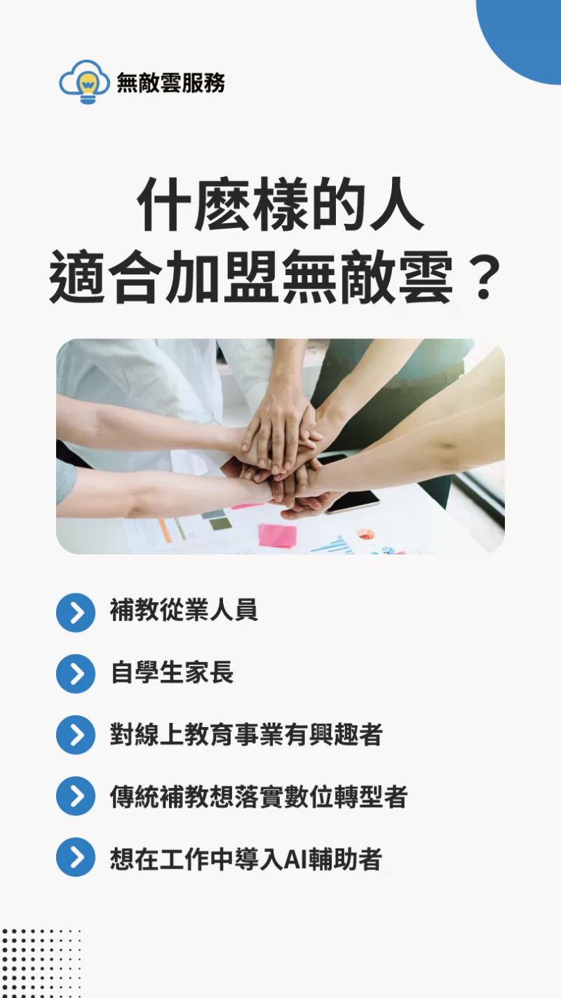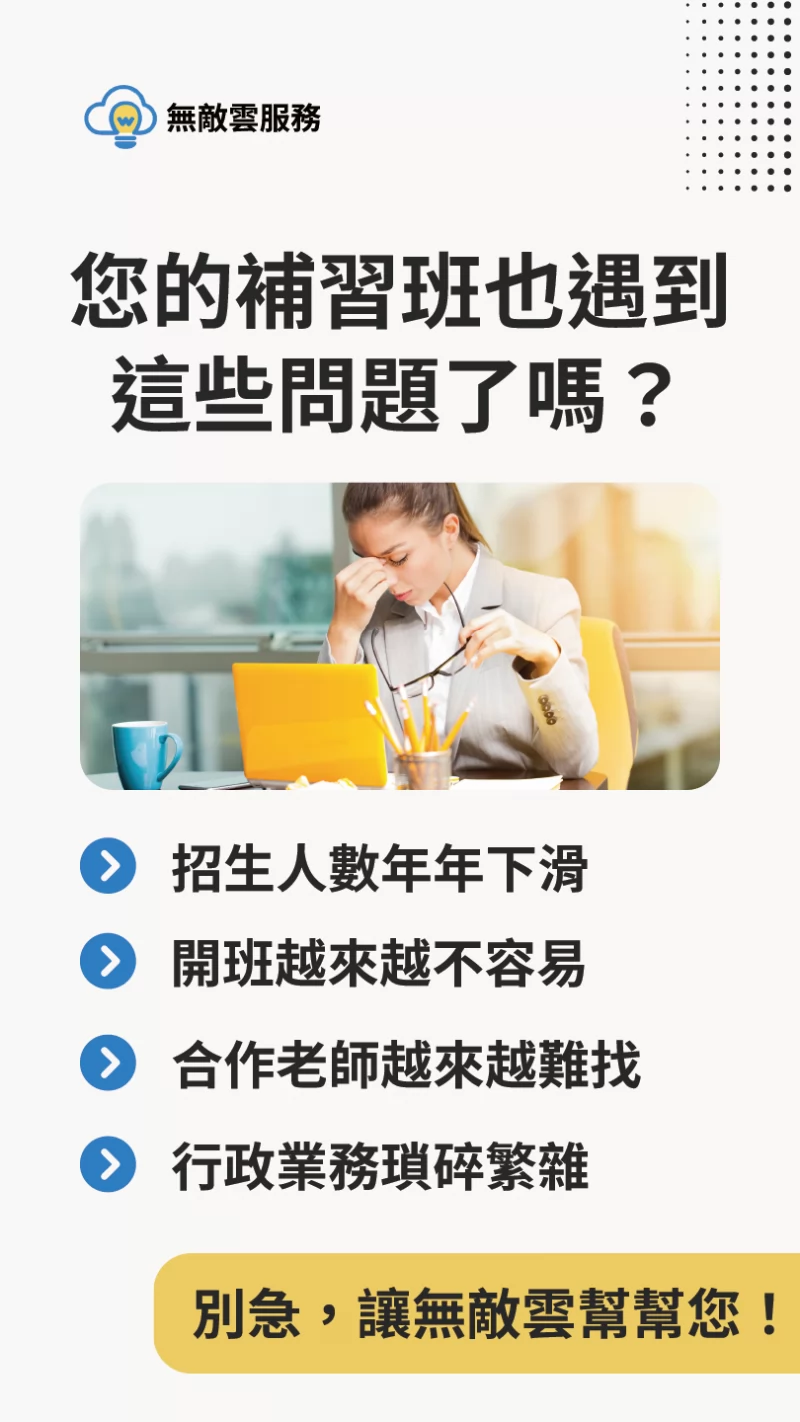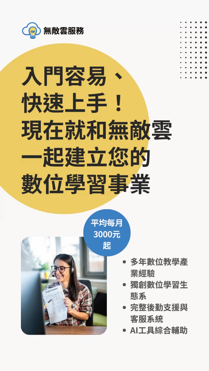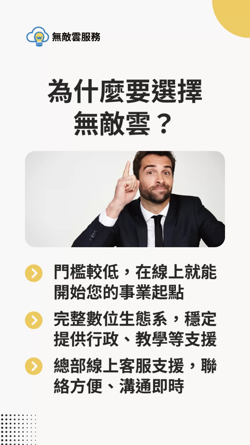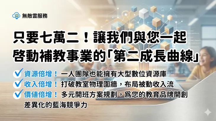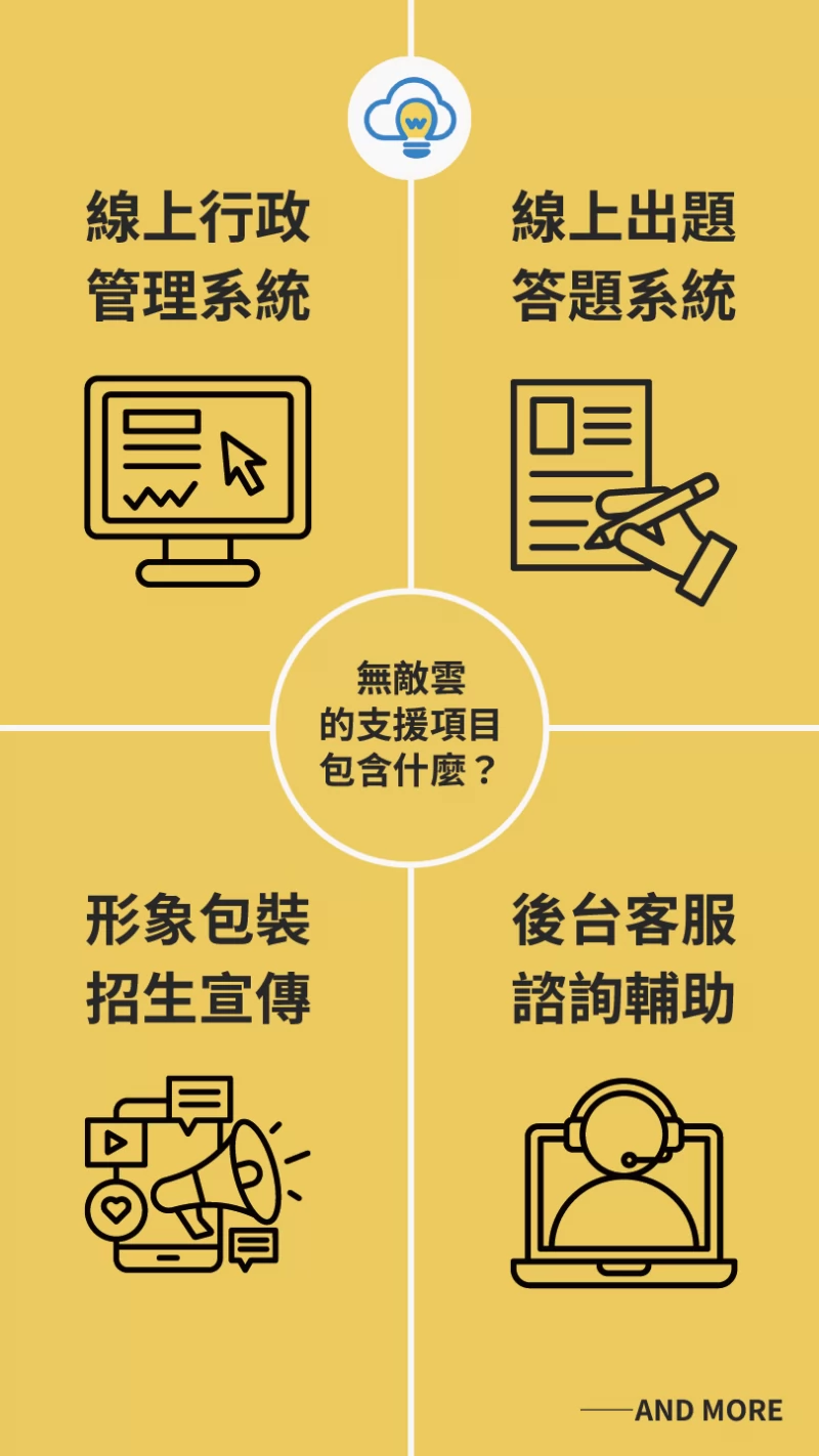 基於這些寶貴的經驗,無敵雲以線上教學為核心,陸續開發相關系統與模組,盼能輔助其他傳統補習班,以更低廉的成本,落實數位轉型,並且擴大招生數量與開班成功率,擴充經營能量。