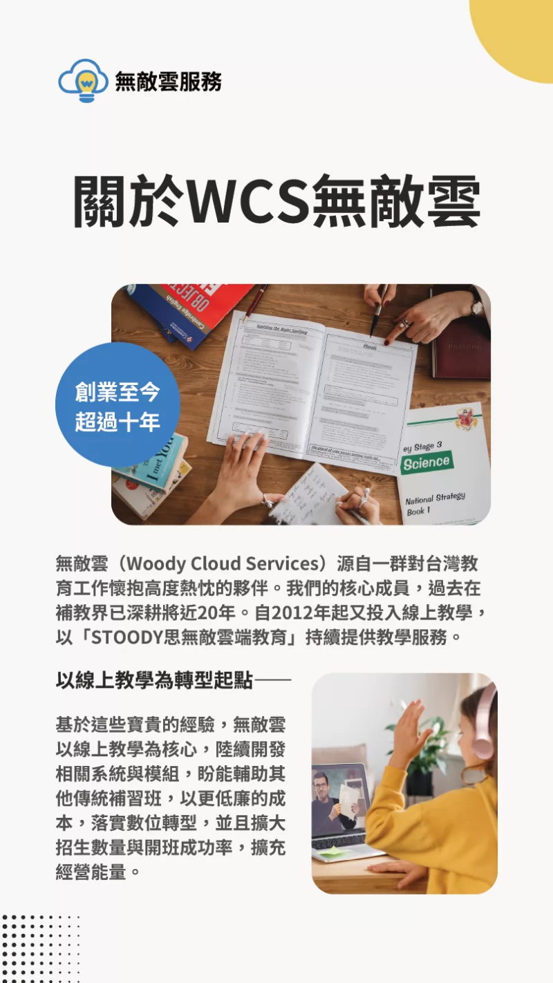 無敵雲(Woody Cloud Services)源自一群對台灣教育工作懷抱高度熱忱的夥伴。我們的核心成員,過去在補教界已深耕將近20年。自2012年起投入線上教學,以「STOODY思無敵雲端教育」持續提供教學服務。